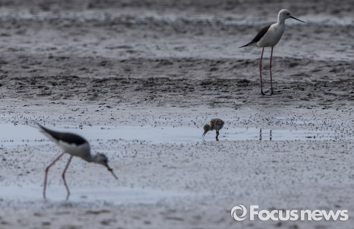 (인천=포커스뉴스)장다리물떼새 가족이26일 오전 수량이갑자기 줄어든 영종도 매립지 습지의물이 고여 있는 곳에서 먹이를 찾고 있다.