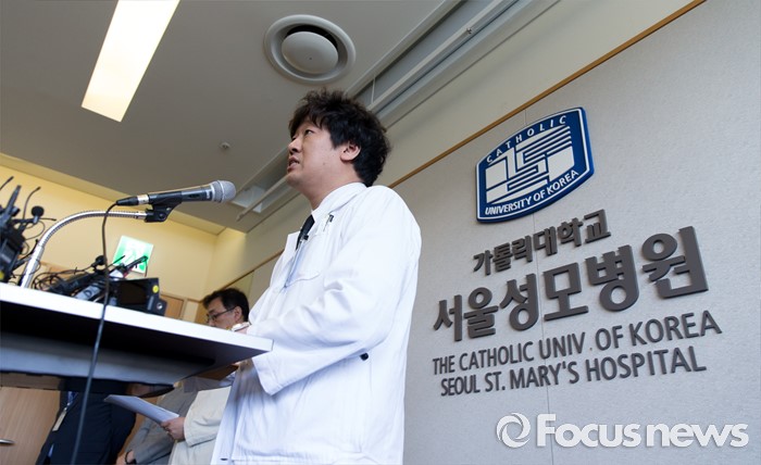 (서울=포커스뉴스) 26일 오후 서울 서초구 서울성모병원에서 서울성모병원 응급의학과 주치의 임지용 교수가 탤런트 김성민 자살시도 관련 브리핑을 하고 있다.