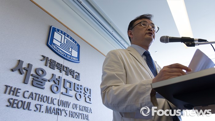 (서울=포커스뉴스) 26일 오후 서울 서초구 서울성모병원에서 장기이식센터장 양철우 교수가 탤런트 김성민 자살시도 관련 브리핑을 하고 있다.