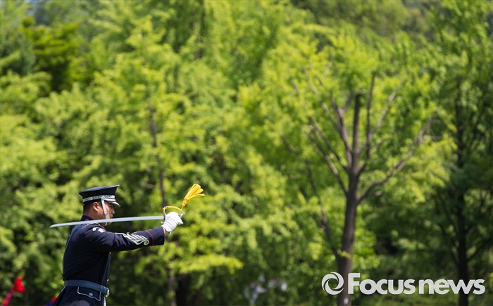 (서울=포커스뉴스) 26일 오후 서울 동작구 국립서울현충원 겨레얼마당에서 국방부 군악대와 의장대가 호국보훈의 달을 맞아 전통의장 및 퍼레이드 시범을 선보이고 있다.