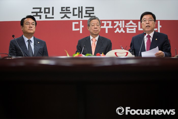 (서울=포커스뉴스) 김희옥(가운데) 새누리당 혁신비대위원장과 정진석(왼쪽) 원내대표, 김광림 정책위의장이 27일 오전 서울 여의도 당사에서 열린 혁신비상대책위원회 회의에 참석하고 있다.