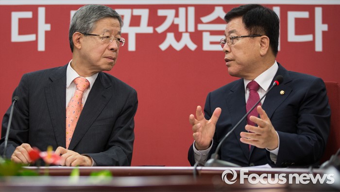 (서울=포커스뉴스) 김희옥(왼쪽) 새누리당 혁신비대위원장과 김광림 정책위의장이 27일 오전 서울 여의도 당사에서 열린 혁신비상대책위원회 회의에 참석해 대화하고 있다.