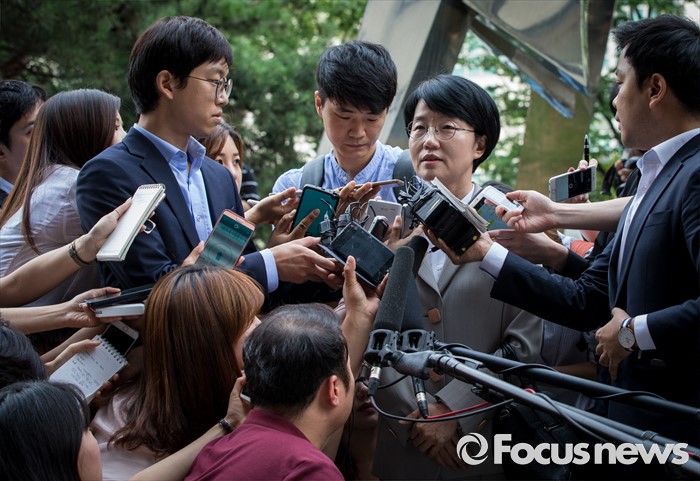 취재진 질문 답하는 박선숙