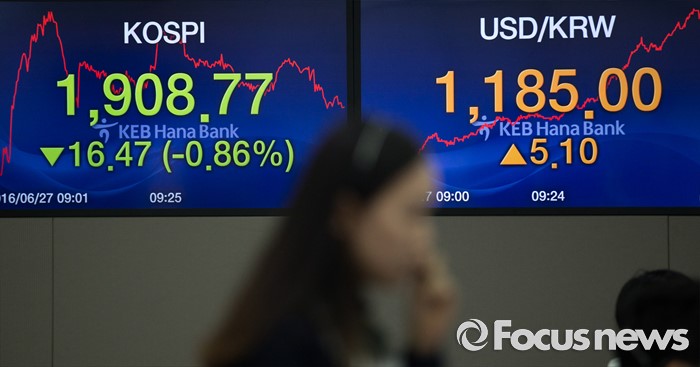 (서울=포커스뉴스) 브렉시트(영국 EU 탈퇴) 충격이 지속되고 있는 27일 오전 서울 중구 명동 KEB 하나은행 딜링룸에서 딜러들이 업무를 보고 있다.코스피는 전 거래일보다 23.39(1.21%) 포인트 하락한 1901.85로, 코스닥은 전 거래일보다 17.95(2.77%) 포인트 하락한 629.21에 시작했다. 원달러 환율은 5.6원 내린 1,174.3원으로 개장했다.