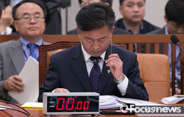 (서울=포커스뉴스) 27일 오전 서울 여의도 국회에서 열린 외교통일위원회 전체회의에 참석한 홍용표 통일부 장관이 안경을 착용하고 있다.