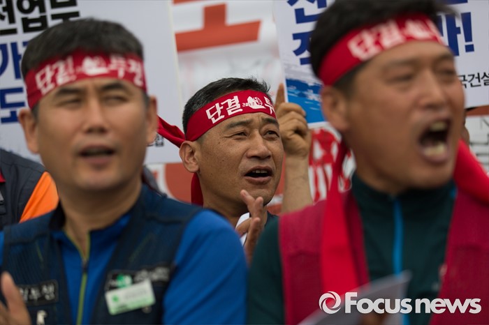(서울=포커스뉴스) 전국건설노동조합 조합원들이 27일 오전 서울 종로구 정부서울청사 앞에서 열린 7.6 총파업 총력투쟁 기자회견에 참석해 함성을 지르고 있다.