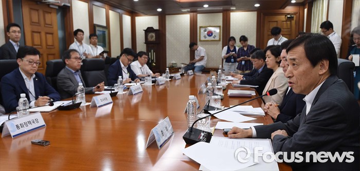 (서울=포커스뉴스) 해외 순방에서 조기 귀국한 이주열 한국은행 총재가 27일 오후 서울 중구 한국은행에서 열린 긴급 간부회의에 참석해 모두발언 하고 있다. 이 총재는 이날 브렉시트(영국의 유럽연합 탈퇴)에 따른 국내외 금융시장 동향 점검 및 대응 방안 논의를 위해 회의를 주재했다.