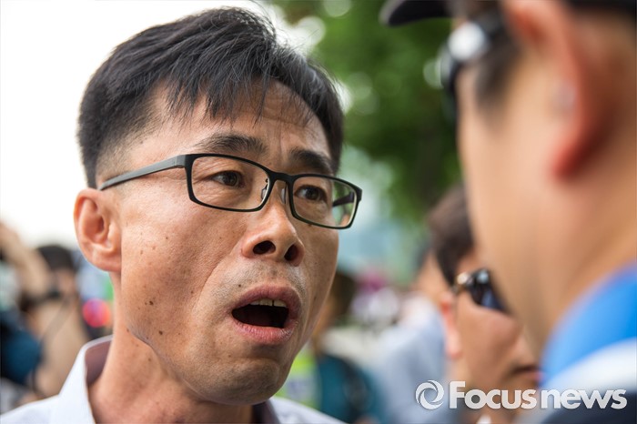 (서울=포커스뉴스) 27일 오후 서울 종로구 정부서울청사 앞에서 세월호 관련 기자회견을 앞두고 있는 관계자가 경찰의 갑작스러운 돗자리 압수와 관련해 경찰에게 항의하고 있다.