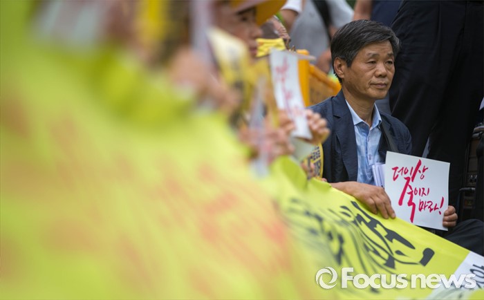 (서울=포커스뉴스) 27일 오후 서울 종로구 청운효자동주민센터 앞에서 416 가족협의회와 416 연대 관계자들이 세월호 특조위 강제해산과 박근혜 정부를 규탄하는 기자회견을 하고 있다.