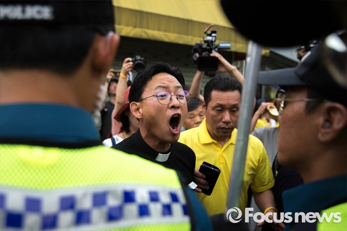 (서울=포커스뉴스) 27일 오후 서울 종로구 정부서울청사 앞에 세월호 관계자들이 세월호 특별법 개정 및 선체 인양을 촉구하는 기자회견을 하기 위해 청운동주민센터 앞으로 이동하던 중 경찰 병력에 의해 길이 가로막히자 행진에 참석한 한 신부가 거칠게 항의하고 있다.