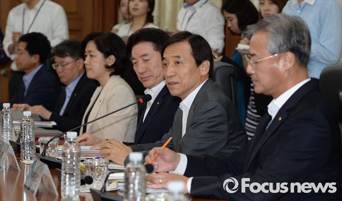 (서울=포커스뉴스) 해외 순방에서 조기 귀국한 이주열 한국은행 총재가 27일 오후 서울 중구 한국은행에서 열린 긴급 간부회의에 참석해 모두발언 하고 있다. 이 총재는 이날 브렉시트(영국의 유럽연합 탈퇴)에 따른 국내외 금융시장 동향 점검 및 대응 방안 논의를 위해 회의를 주재했다.