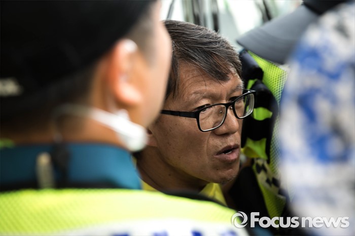 (서울=포커스뉴스) 27일 오후 서울 종로구 정부서울청사 앞에서 세월호 관련 기자회견을 앞두고 있는 시민이 경찰 병력에 의해 저지당하고 있다.