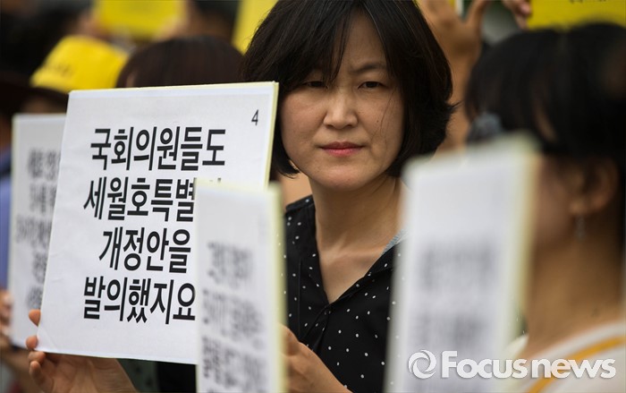 (서울=포커스뉴스) 27일 오후 서울 종로구 정부서울청사 앞에 세월호 관계자들이 세월호 특별법 개정 및 선체 인양을 촉구하는 손피켓을 들고 있다.