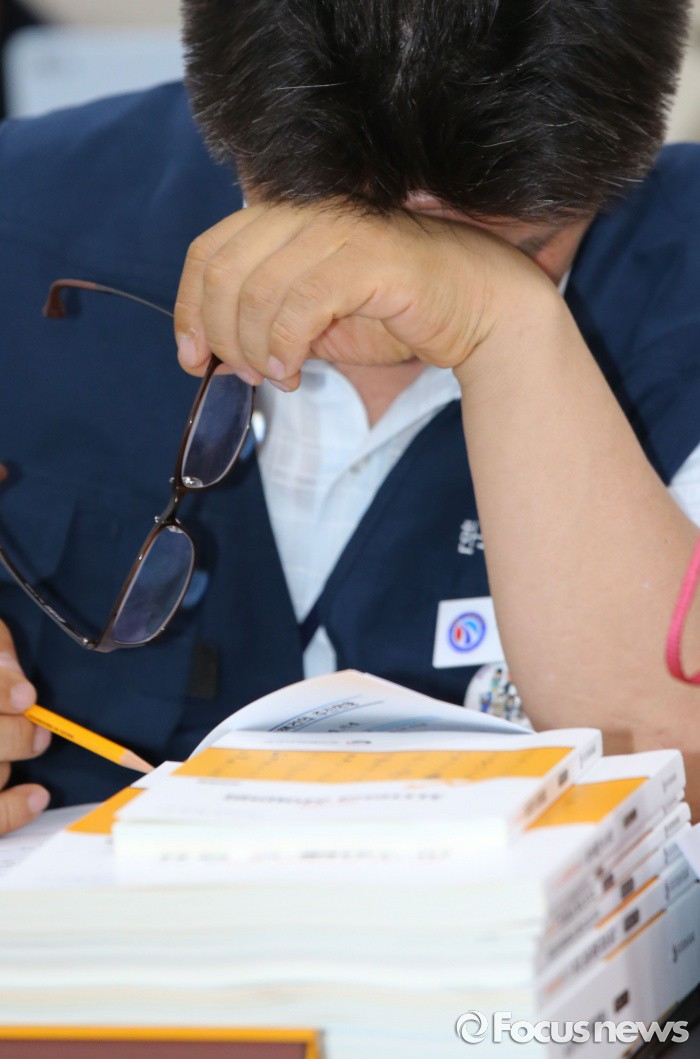 (세종=포커스뉴스) 노동가위원이 27일 오후 세종시 정부세종청사 고용노동부 전원회의실에서 열린 최저임금위원회 제6차 전원회의에서 자료를 살피고 있다.