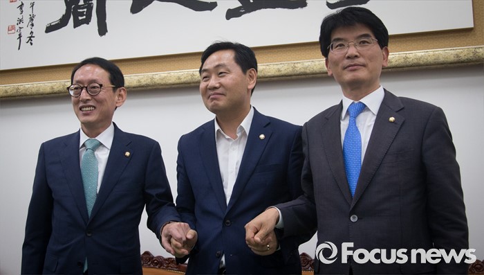 (서울=포커스뉴스) 7월 임시국회 일정 등을 논의하기 위해 모인 여야 3당 원내수석부대표가 27일 오후 서울 여의도 국회에서 회동에 앞서 손을 맞잡고 있다. 왼쪽부터 김도읍 새누리당, 김관영 국민의당, 박완주 더불어민주당 원내수석부대표