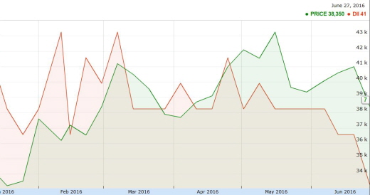2015년 7월14일 52주 최고가(4만6400원)와 비교했을 때 17.34% 하락한 수치다.