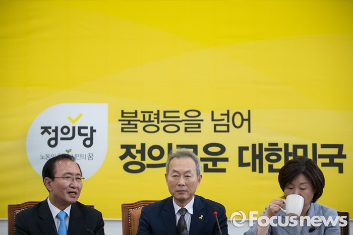 (서울=포커스뉴스) 심상정(오른쪽) 정의당 대표와 노회찬 원내대표가 28일 오전 서울 여의도 국회에서 이석태(가운데) 세월호 특조위 위원장을 접견하고 있다.