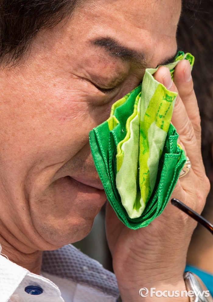 (서울=포커스뉴스) 28일 오전 서울행정법원 앞에서 열린 세월호 희생 기간제교사 순직 인정 촉구 소송 기자회견에 참석한 故 김초원 교사의 부친 성욱씨가 순직 인정을 촉구하는 발언 후 눈물을 훔치고 있다.
