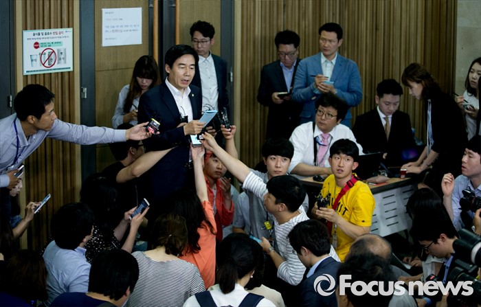 (서울=포커스뉴스) 28일 오전 서울 여의도 국회 의원회관에서 왕주현 전 사무부총장 구속 등 리베이트 수수 의혹 관련 비공개 국민의당 의원총회를 마친 이용호 원내대변인이 결과 브리핑을 하고 있다.