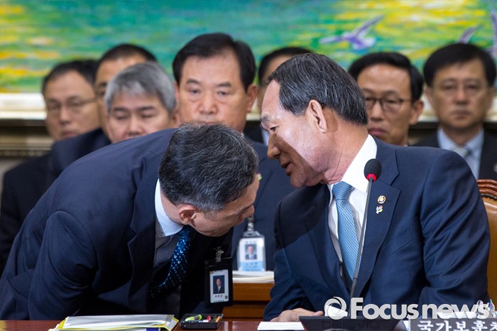 (서울=포커스뉴스) 박승춘(오른쪽) 국가보훈처장이 28일 오전 서울 여의도 국회에서 열린 정무위원회에 참석해 최완근 국가보훈처 차장과 대화를 나누고 있다.
