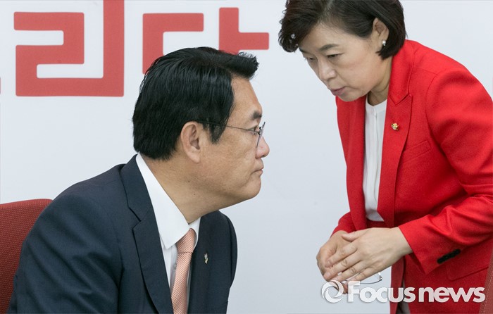 (서울=포커스뉴스) 28일 오전 서울 여의도 국회에서 정진석(왼쪽) 새누리당 원내대표가 박용만 대한상공회의소 회장을 기다리며 김정재 원내대변인과 대화하고 있다.