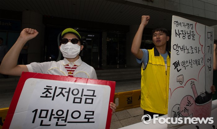 (서울=포커스뉴스) 28일 오전 서울 마포구 한국경영자총연합회 회관 앞에서 알바노조 조합원들이 10년 연속 최저임금 동결을 주장하는 경총 규탄 구호를 외치고 있다.