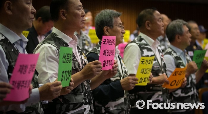 (서울=포커스뉴스) 28일 오전 서울 여의도 국회 헌정기념관에서 열린 '임을 위한 행진곡' 기념곡 지정저지 범국민대책본부 출범식 및 결의대회에 참석한 관련단체 회원 및 참석자들이 피켓을 들고 구호를 외치고 있다.