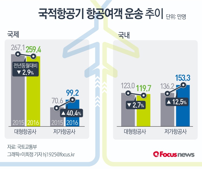 (서울=포커스뉴스) 28일 발표한 국토교통부 '2016년 5월 항공운송시장 국제 및 국내 여객 추이'에 따르면 국제선과 국내선 모두 전년동월대비 국적 저가항공사 여객운송량이 증가했다.