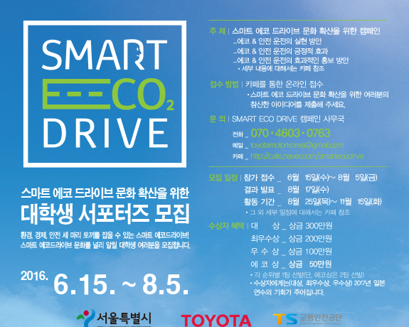 서울=포커스뉴스) 한국토요타자동차는 서울특별시, 교통안전공단과 공동으로 '2016 스마트 에코 드라이브 (SMART ECO DRIVE) 프로젝트'에 참여할 대학생을 모집한다고 28일 밝혔다.