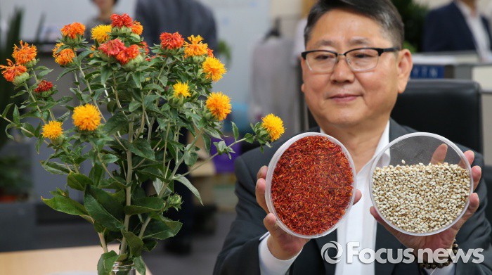 (세종=포커스뉴스) 이종기 농촌진흥청 인삼특작부장이 28일 오전 세종시 정부세종청사 농림축산식품부 기자실에서 폐암, 위암, 식도암 등 고형암에 대표적으로 사용하는 항암제의 부작용을 줄이 수 있는 잇꽃(홍화)씨 추출물의 효과를 구명했다고 밝히고 있다.