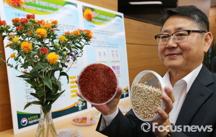 (세종=포커스뉴스) 이종기 농촌진흥청 인삼특작부장이 28일 오전 세종시 정부세종청사 농림축산식품부 기자실에서 폐암, 위암, 식도암 등 고형암에 대표적으로 사용하는 항암제의 부작용을 줄이 수 있는 잇꽃(홍화)씨 추출물의 효과를 구명했다고 밝히고 있다.