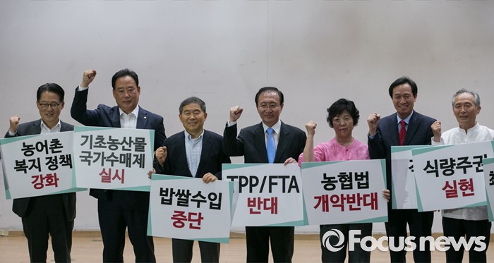 (서울=포커스뉴스) 28일 오후 서울 여의도 국회 의원회관에서 열린 20대 국회가 꼭 해야 할 농업개혁 과제 정책토론회에 참석한 우상호(오른쪽 두번째) 더불어민주당 원내대표, 박지원(왼쪽 첫번째) 국민의당 원내대표, 노회찬(왼쪽 네번째) 정의당 원내대표 등 의원 및 참석자들이 피켓을 들고 기념촬영을 하고 있다.