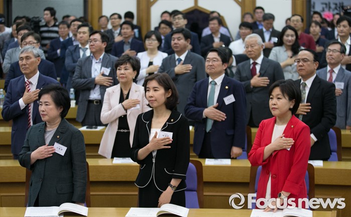 (서울=포커스뉴스) 28일 오후 서울 여의도 국회 의원회관에서 열린 4차 산업혁명포럼 창립총회에 참석한 송희경(앞줄 오른쪽부터) 새누리당 의원, 박경미 더불어민주당 의원, 신용현 국민의당 의원 등 의원 및 참석자들이 국기에 대한 경례를 하고 있다. 이날 창립한 포럼은 여야 3당 비례대표 1번인 송희경 새누리당 의원, 박경미 더불어민주당 의원, 신용현 국민의당 의원을 주축으로 구성된 포럼이다.