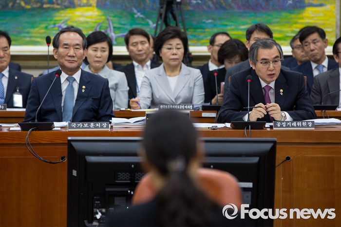 (서울=포커스뉴스) 정재찬(오른쪽) 공정거래위원회 위원장이 28일 오후 서울 여의도 국회에서 열린 정무위원회에 참석해 질의응답 하고 있다. 사진 왼쪽은 박승춘 국가보훈처장.