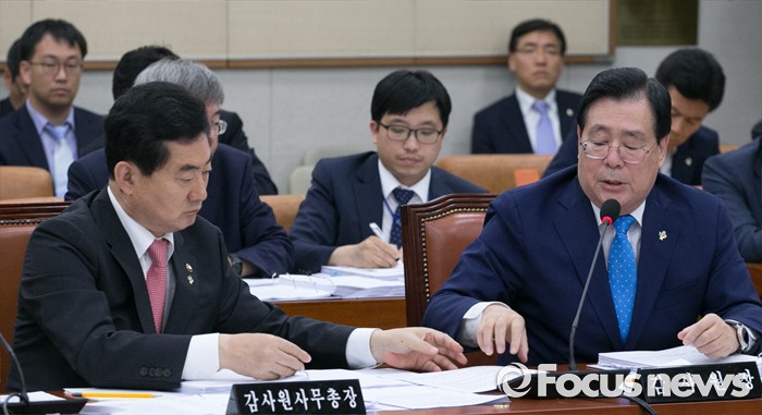 (서울=포커스뉴스) 28일 오후 서울 여의도 국회에서 열린 법제사법위원회 전체회의에 참석한 황찬현(오른쪽) 감사원장이 이완수 사무총장으로부터 자료를 받고 있다.