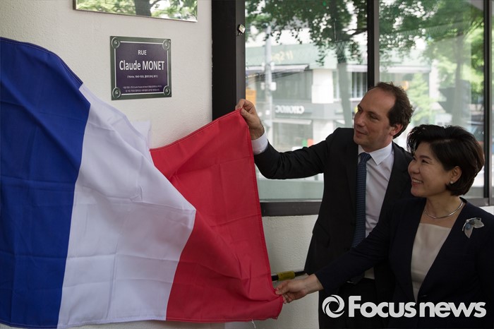 (서울=포커스뉴스) 28일 오후 서울 서초구 서울프랑스학교에서 파비앙 페논(오른쪽 두 번째) 주한 프랑스 대사와 조은희 서초구청장이 '파리식 길 표지판 공개 행사'에 참석해 표지판 제막을 하고 있다.