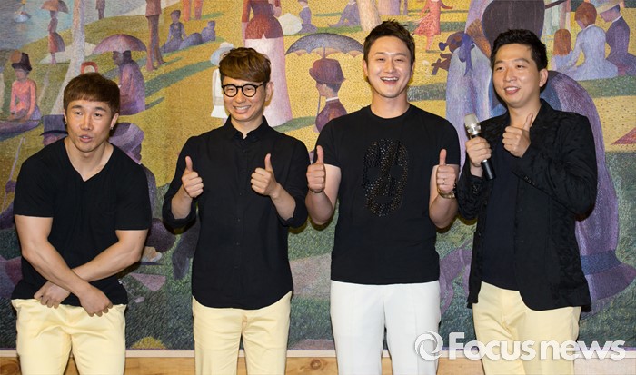 (서울=포커스뉴스) 28일 오후 서울 마포구 신한류플러스에서 여린 제1회 홍대 코미디위크 기자간담회에 참석한 쇼그맨팀 맴버들이 포즈를 취하고 있다. 왼쪽부터 이종훈, 박성호, 김원효, 정범균
