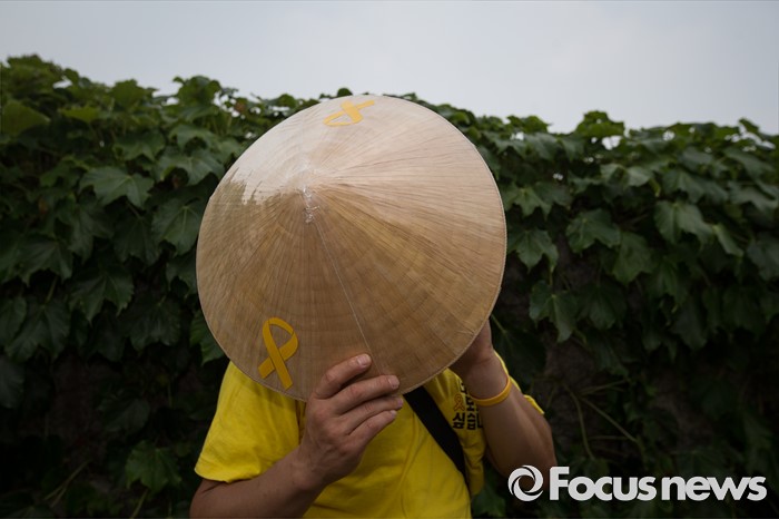(서울=포커스뉴스) 세월호 참사 유가족이 28일 오후 서울 여의도 국회 앞에서 20대 국회, 6월 임시국회에 특별법 개정을 촉구하는 기자회견을 하던 중 모자로 햇볕을 가리고 있다.