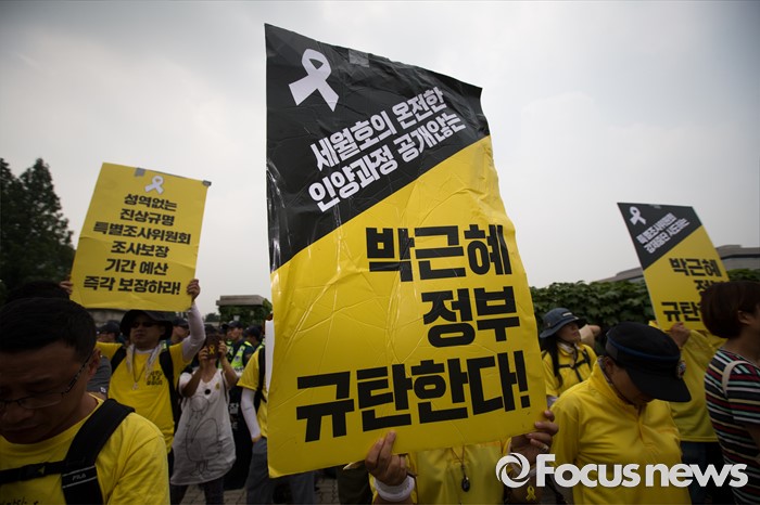(서울=포커스뉴스) 416가족협의회와 4월16의약속국민연대가 28일 오후 서울 여의도 국회 앞에서 '20대 국회 6월 임시국회에 특별법 개정을 촉구하는 기자회견을 하고 있다.