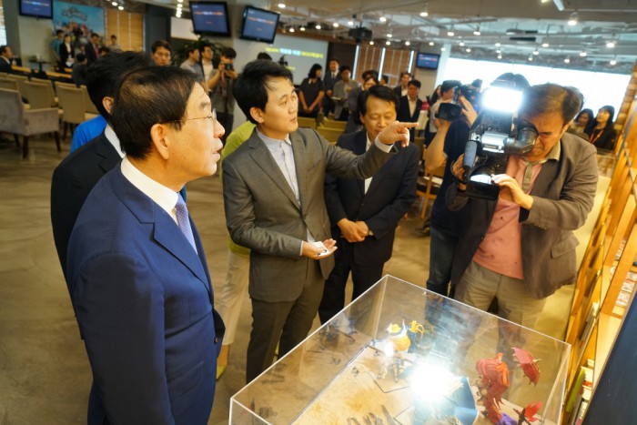 한편, 넷마블은 산단공과 함께 연내 인허가를 완료하고 2017년 2월 착공해, 2019년 9월 입주한다는 계획이다.넷마블 방준혁 의장이 박원순 시장(좌측)에게 넷마블 본사 20층에 위치한 책방에 대해 설명하고 있다. 오른쪽은 이성 구로구청장. <사진제공=넷마블>G밸리 지스퀘어 조감도 <사진제공=넷마블>