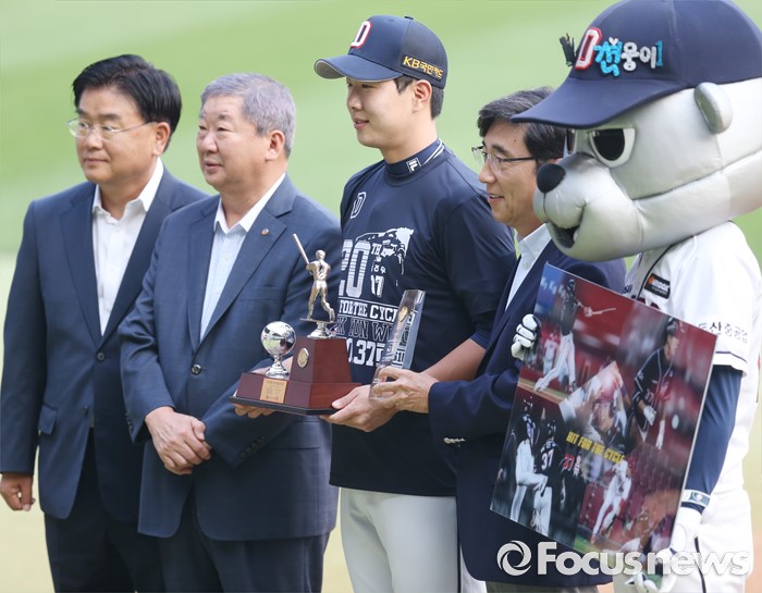 (서울=포커스뉴스) 28일 서울 잠실구장에서 열린 2016 프로야구 NC-두산 경기에 앞서 두산 박건우의 사이클링 안타 기록 시상식을 갖고 기념사진을 찍고 있다. 왼쪽부터 김태룡 두산 단장, 구본능 KBO 총재, 박건우, 김승영 두산 사장.