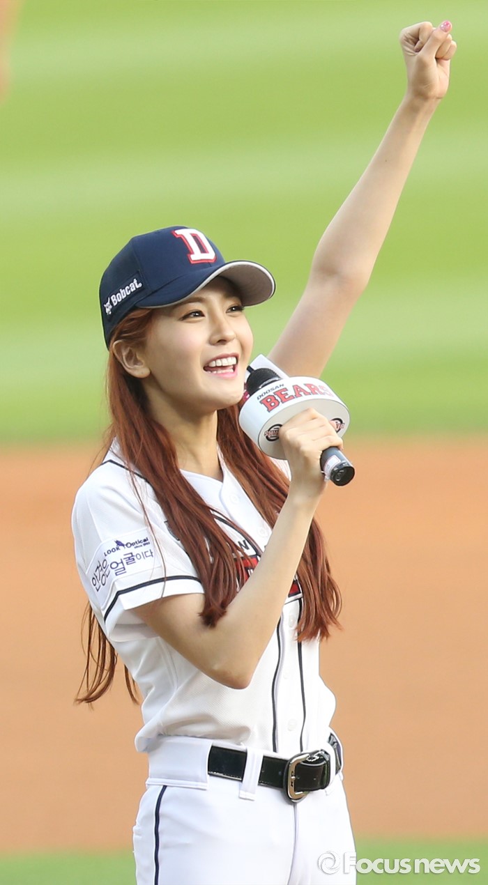 (서울=포커스뉴스) 28일 서울 잠실구장에서 열린 2016 프로야구 NC-두산 경기에서 시구자로 나온 걸그룹 소나무의 나현이 관중에게 인사하고 있다.