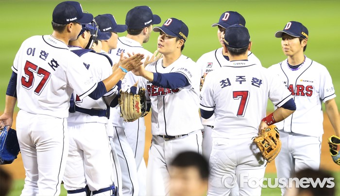 (서울=포커스뉴스) 28일 서울 잠실구장에서 열린 2016 프로야구 NC-두산 경기에서 NC를 물리치고 50승을 한 두산 선수들이 마운드에 모여 하이파이브하고 있다.