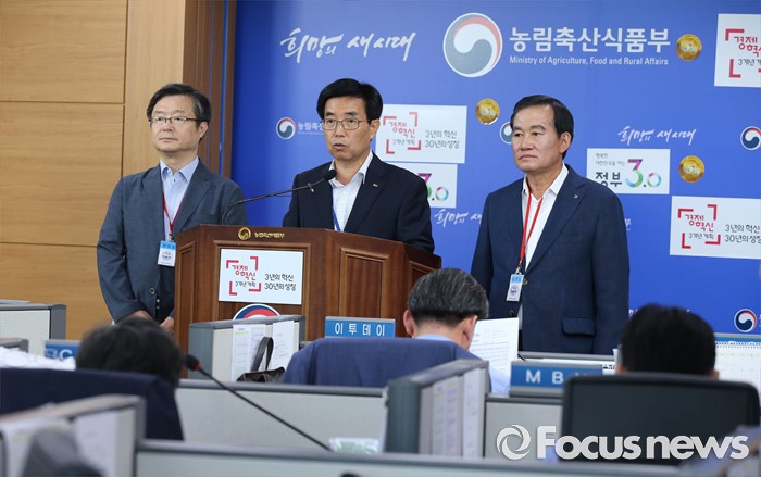(세종=포커스뉴스) 이근성 낙농진흥회장이 28일 오후 세종시 농림축산식품부 기자실에서 2016년 원유기본가격을 전년보다 18원 인하한 리터당 922원으로 결정했다고 밝히고 있다. 왼쪽부터 박상도 한국유가공협회 전무, 이근성 낙농진흥회장, 신관우 충북낙농협동조합장.