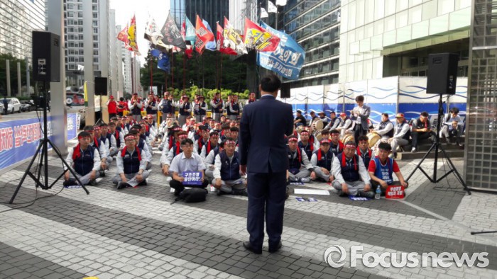 전날 자정부터 무박2일 상경투쟁에 돌입한 삼성중공업 노협은 이날 오전 11시 산업은행 본점 앞에서 결의대회를 이어나간 뒤 거제로 돌아갈 예정이다.29일 오전 삼성중공업 노동자협의회 소속 근로자 150여명은 서울 서초동 삼성 본관 앞에서 '구조조정 저지! 자구안 철폐! 결의대회'를 열었다. 2016.06.29 김성훈 기자 shkim1222@focus.co.kr
