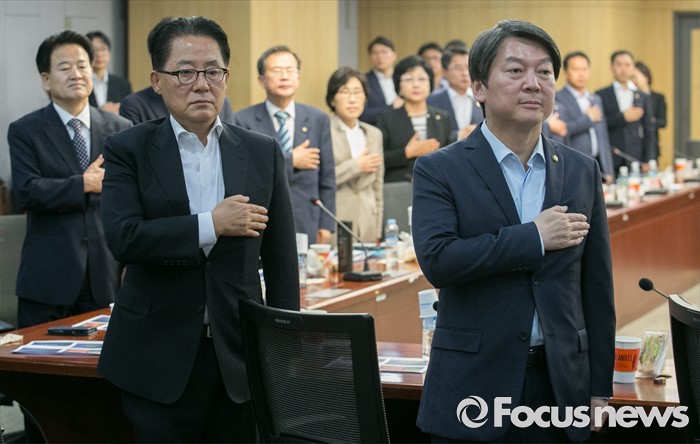 (서울=포커스뉴스) 29일 오전 서울 여의도 국회 의원회관에서 열린 국민의당 정책역량강화 워크숍에 참석한 안철수(오른쪽) 상임공동대표와 박지원 원내대표 등 의원들이 국기에 대한 경례를 하고 있다.