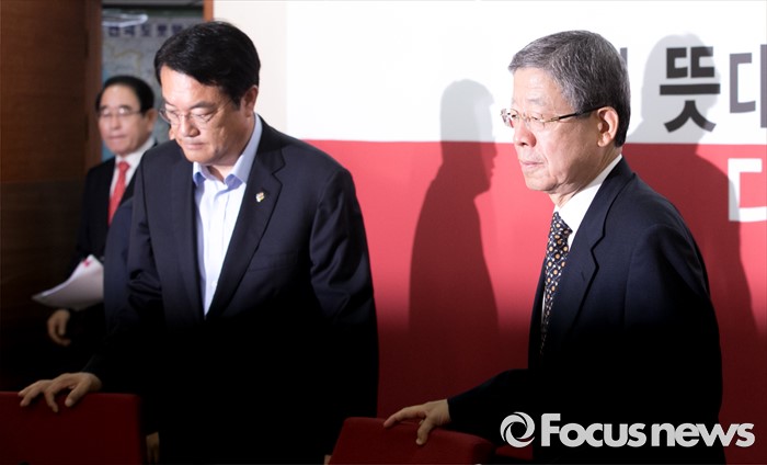 (서울=포커스뉴스) 김희옥(오른쪽) 새누리당 혁신비상대책위원장, 정진석 원내대표가 29일 오전 서울 여의도 당사에서 열린 혁신비대위원회의에 참석하고 있다.