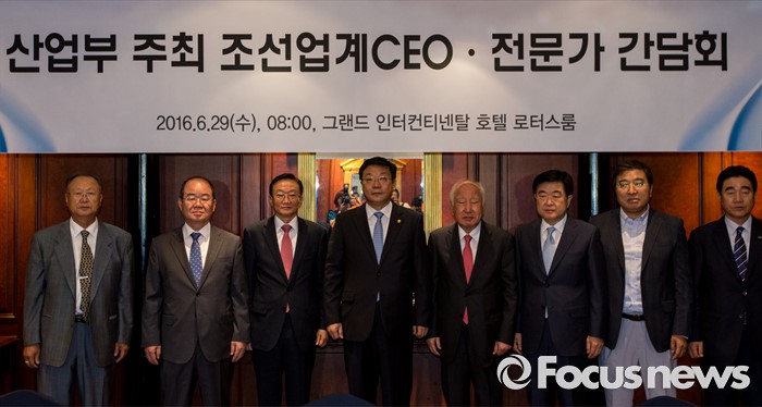 (서울=포커스뉴스) 29일 오전 서울 강남구 그랜드 인터콘티넨탈 호텔에서 열린 산업부 주최 조선업계 CEO ·전문가 간담회에 참석한 주형환(왼쪽 네번째) 산업통상자원부 장관 및 참석자들이 기념촬영을 갖고 있다.