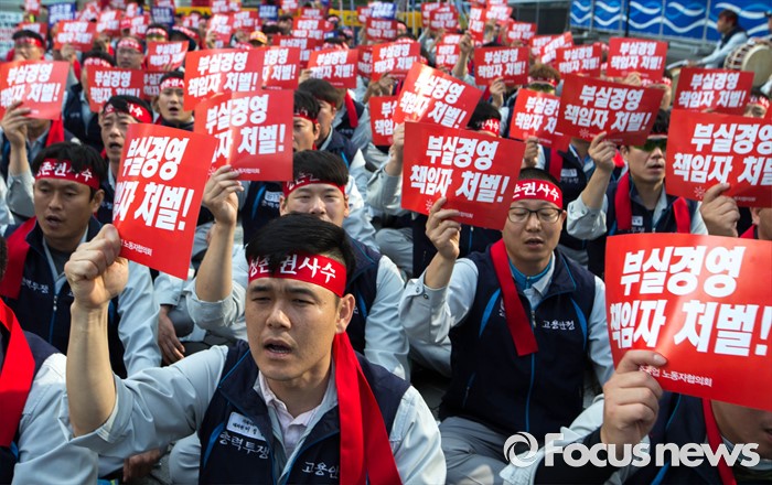 (서울=포커스뉴스) 29일 오전 서울 서초구 삼성 사옥 앞에서 삼성중공업 노동협의회 관계자들이 구조조정에 반대하는 시위를 하고 있다. 삼성중공업은 지난 15일 임원들의 임금 반납, 희망퇴직 등이 포함된 구조조정안을 공개했으며 올해 약 1500명 규모의 희망퇴직을 단행할 계획이라 밝혔다.
