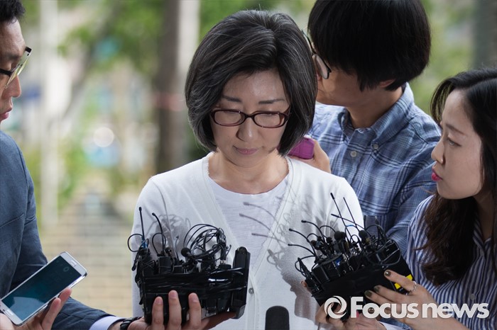 검찰은 이날 최 전 회장에 대한 두번째 소환 조사를 마치고 구속영장 재청구 여부를 결정할 방침이다.(서울=포커스뉴스) 미공개 정보를 이용해 주가하락 손실을 피한 혐의를 받고 있는 최은영 전 한진해운 회장이 피의자 신분으로 8일 오전 서울 양천구 서울남부지검에 들어서며 취재진 질문을 받고 있다. 2016.06.08 오장환 기자